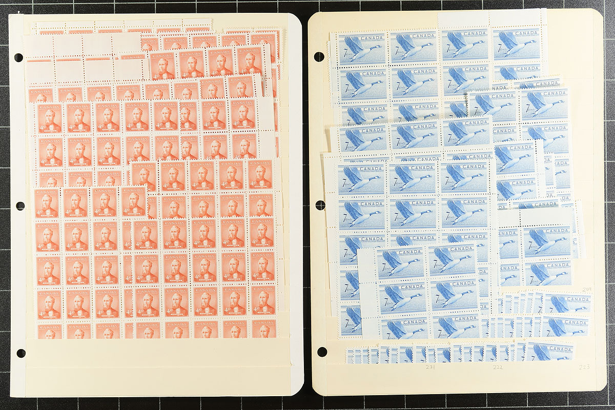 Volume 1 Mint Canada wholesale stock (#284/342). This volume is late King George VI to early Queen Elizabeth II. Generally one issue per stockpage. Anywhere from 20 to a couple hundred stamps per page. Lots of multiples with relatively few plate blocks. A quick check indicates that most, if not all, are never hinged. We noted better, such as Capex ’51, Totem dollar (72 copies, including a few plate blocks), 50c Textiles (nearly 100 copies including several plate blocks), and some plate blocks amongst the QEII Wilding issue. Enormous catalogue value here and a conservative face value (no premiums for "better" or plate blocks is $343.00. Estimate =
