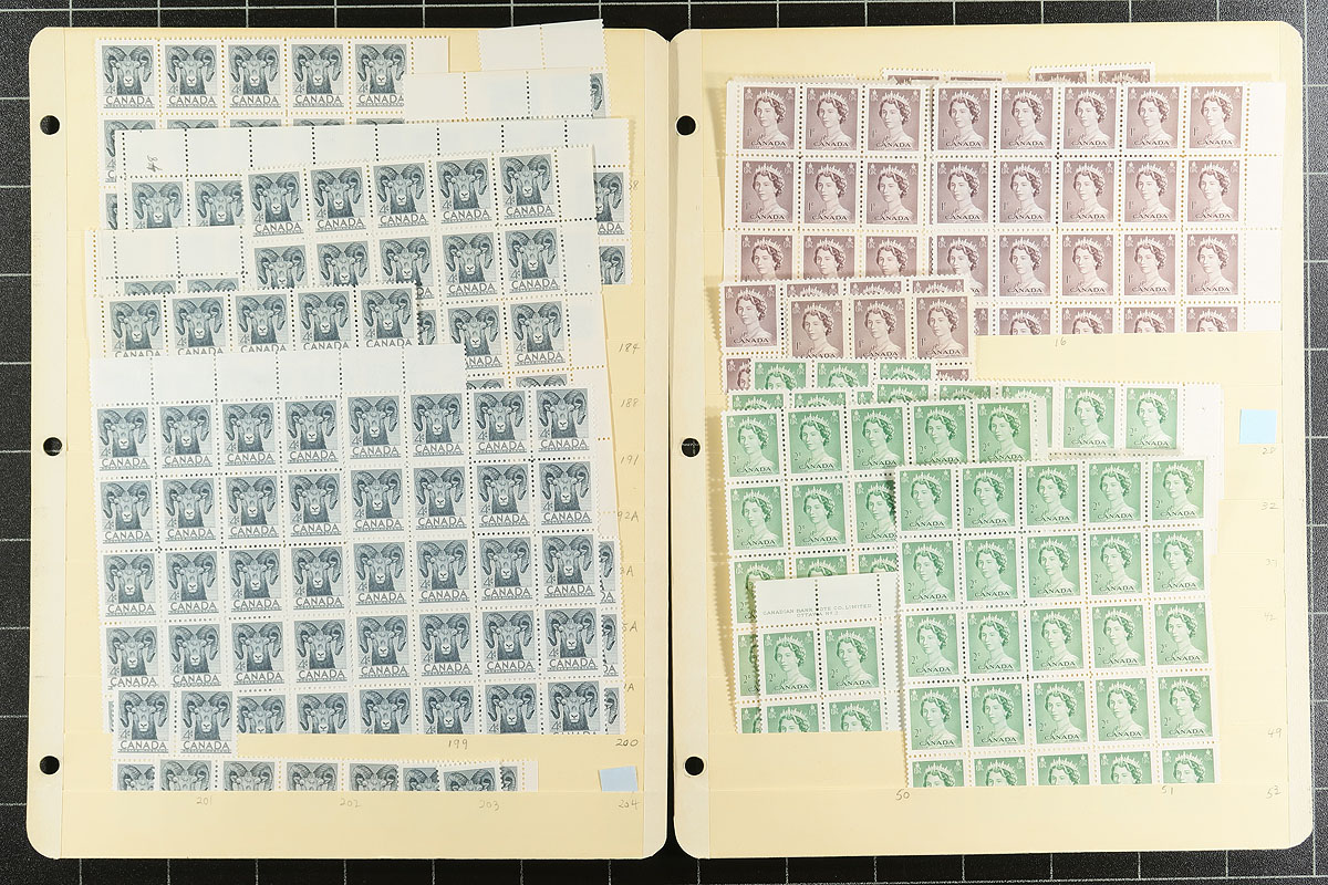 Volume 1 Mint Canada wholesale stock (#284/342). This volume is late King George VI to early Queen Elizabeth II. Generally one issue per stockpage. Anywhere from 20 to a couple hundred stamps per page. Lots of multiples with relatively few plate blocks. A quick check indicates that most, if not all, are never hinged. We noted better, such as Capex ’51, Totem dollar (72 copies, including a few plate blocks), 50c Textiles (nearly 100 copies including several plate blocks), and some plate blocks amongst the QEII Wilding issue. Enormous catalogue value here and a conservative face value (no premiums for "better" or plate blocks is $343.00. Estimate =