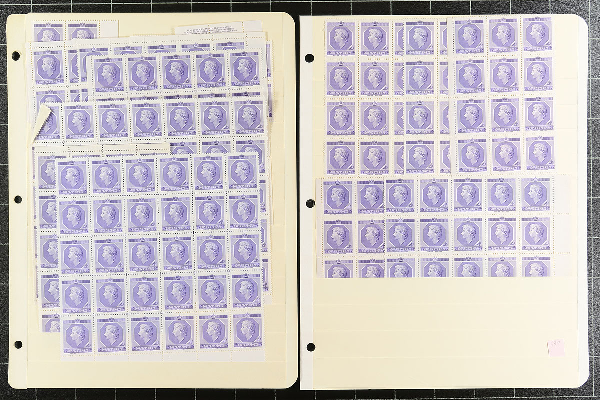 Volume 1 Mint Canada wholesale stock (#284/342). This volume is late King George VI to early Queen Elizabeth II. Generally one issue per stockpage. Anywhere from 20 to a couple hundred stamps per page. Lots of multiples with relatively few plate blocks. A quick check indicates that most, if not all, are never hinged. We noted better, such as Capex ’51, Totem dollar (72 copies, including a few plate blocks), 50c Textiles (nearly 100 copies including several plate blocks), and some plate blocks amongst the QEII Wilding issue. Enormous catalogue value here and a conservative face value (no premiums for "better" or plate blocks is $343.00. Estimate =