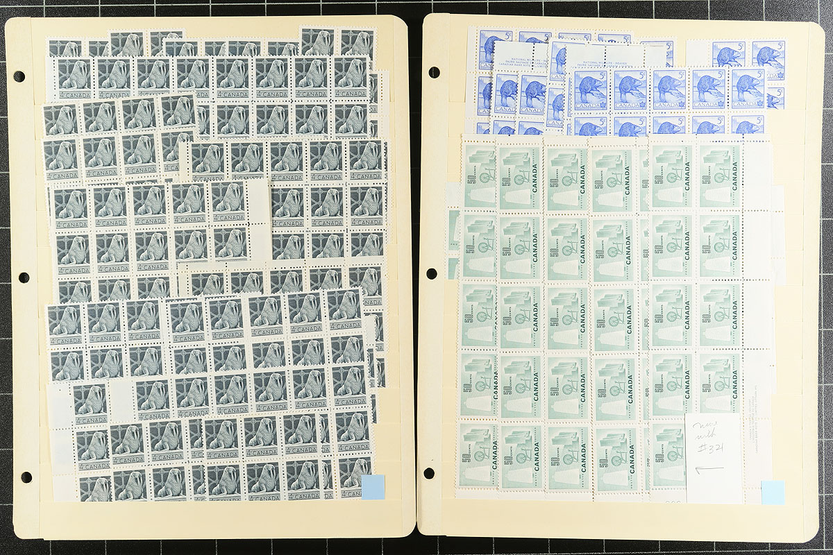Volume 1 Mint Canada wholesale stock (#284/342). This volume is late King George VI to early Queen Elizabeth II. Generally one issue per stockpage. Anywhere from 20 to a couple hundred stamps per page. Lots of multiples with relatively few plate blocks. A quick check indicates that most, if not all, are never hinged. We noted better, such as Capex ’51, Totem dollar (72 copies, including a few plate blocks), 50c Textiles (nearly 100 copies including several plate blocks), and some plate blocks amongst the QEII Wilding issue. Enormous catalogue value here and a conservative face value (no premiums for "better" or plate blocks is $343.00. Estimate =