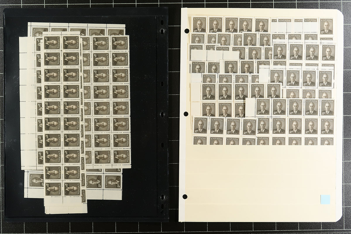 Volume 1 Mint Canada wholesale stock (#284/342). This volume is late King George VI to early Queen Elizabeth II. Generally one issue per stockpage. Anywhere from 20 to a couple hundred stamps per page. Lots of multiples with relatively few plate blocks. A quick check indicates that most, if not all, are never hinged. We noted better, such as Capex ’51, Totem dollar (72 copies, including a few plate blocks), 50c Textiles (nearly 100 copies including several plate blocks), and some plate blocks amongst the QEII Wilding issue. Enormous catalogue value here and a conservative face value (no premiums for "better" or plate blocks is $343.00. Estimate =