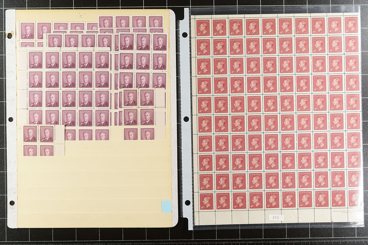 Volume 1 Mint Canada wholesale stock (#284/342). This volume is late King George VI to early Queen Elizabeth II. Generally one issue per stockpage. Anywhere from 20 to a couple hundred stamps per page. Lots of multiples with relatively few plate blocks. A quick check indicates that most, if not all, are never hinged. We noted better, such as Capex ’51, Totem dollar (72 copies, including a few plate blocks), 50c Textiles (nearly 100 copies including several plate blocks), and some plate blocks amongst the QEII Wilding issue. Enormous catalogue value here and a conservative face value (no premiums for "better" or plate blocks is $343.00. Estimate =