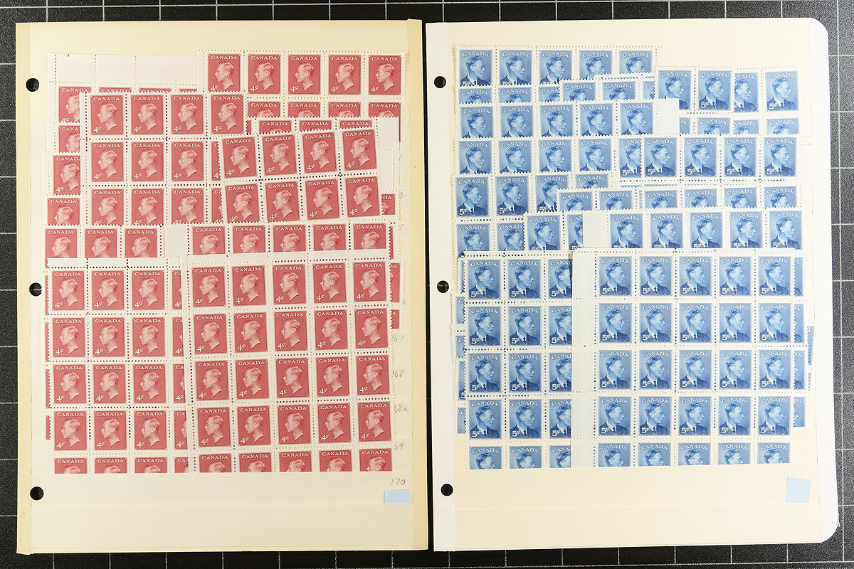 Volume 1 Mint Canada wholesale stock (#284/342). This volume is late King George VI to early Queen Elizabeth II. Generally one issue per stockpage. Anywhere from 20 to a couple hundred stamps per page. Lots of multiples with relatively few plate blocks. A quick check indicates that most, if not all, are never hinged. We noted better, such as Capex ’51, Totem dollar (72 copies, including a few plate blocks), 50c Textiles (nearly 100 copies including several plate blocks), and some plate blocks amongst the QEII Wilding issue. Enormous catalogue value here and a conservative face value (no premiums for "better" or plate blocks is $343.00. Estimate =