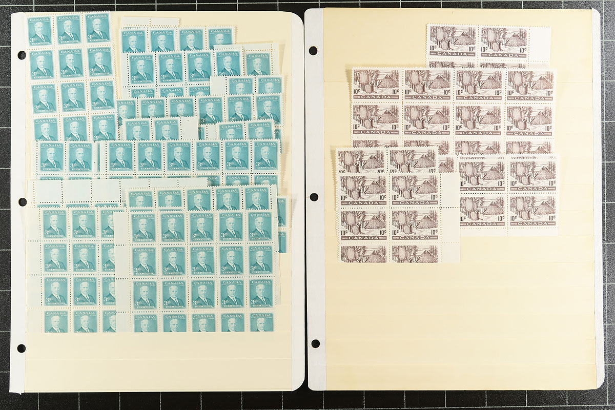 Volume 1 Mint Canada wholesale stock (#284/342). This volume is late King George VI to early Queen Elizabeth II. Generally one issue per stockpage. Anywhere from 20 to a couple hundred stamps per page. Lots of multiples with relatively few plate blocks. A quick check indicates that most, if not all, are never hinged. We noted better, such as Capex ’51, Totem dollar (72 copies, including a few plate blocks), 50c Textiles (nearly 100 copies including several plate blocks), and some plate blocks amongst the QEII Wilding issue. Enormous catalogue value here and a conservative face value (no premiums for "better" or plate blocks is $343.00. Estimate =