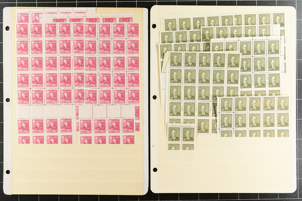 Volume 1 Mint Canada wholesale stock (#284/342). This volume is late King George VI to early Queen Elizabeth II. Generally one issue per stockpage. Anywhere from 20 to a couple hundred stamps per page. Lots of multiples with relatively few plate blocks. A quick check indicates that most, if not all, are never hinged. We noted better, such as Capex ’51, Totem dollar (72 copies, including a few plate blocks), 50c Textiles (nearly 100 copies including several plate blocks), and some plate blocks amongst the QEII Wilding issue. Enormous catalogue value here and a conservative face value (no premiums for "better" or plate blocks is $343.00. Estimate =