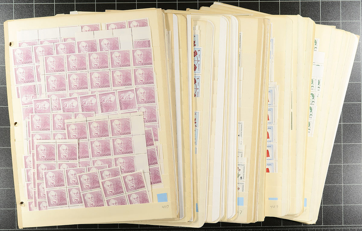 Volume 2 Mint Canada wholesale stock (#410/460). This volume is from the Gzowski issue to the low value Centennials (plus the 7c and 8c later values). Generally, one issue per stockpage. Anywhere from 20 to a couple hundred stamps per page. Lots of multiples with relatively few plate blocks. A quick check indicates that most, if not all, are never hinged. We noted better, such as 15c Geese, Provincial Coat of Arms, Planes, and lots of lower denomination Centennials. Enormous catalogue value here and a conservative face value is $260.00. Estimate =