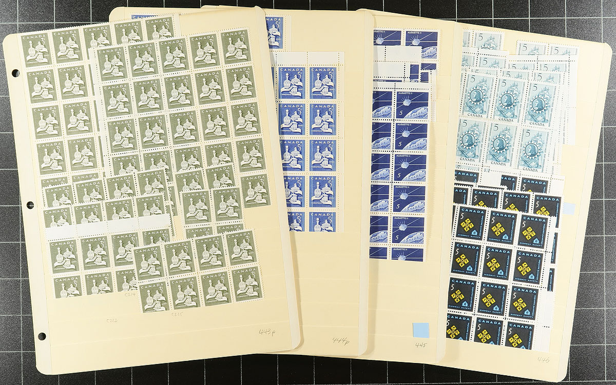 Volume 2 Mint Canada wholesale stock (#410/460). This volume is from the Gzowski issue to the low value Centennials (plus the 7c and 8c later values). Generally, one issue per stockpage. Anywhere from 20 to a couple hundred stamps per page. Lots of multiples with relatively few plate blocks. A quick check indicates that most, if not all, are never hinged. We noted better, such as 15c Geese, Provincial Coat of Arms, Planes, and lots of lower denomination Centennials. Enormous catalogue value here and a conservative face value is $260.00. Estimate =