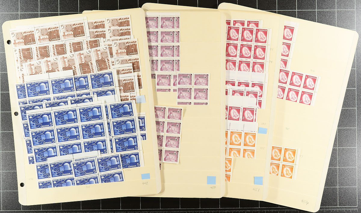 Volume 2 Mint Canada wholesale stock (#410/460). This volume is from the Gzowski issue to the low value Centennials (plus the 7c and 8c later values). Generally, one issue per stockpage. Anywhere from 20 to a couple hundred stamps per page. Lots of multiples with relatively few plate blocks. A quick check indicates that most, if not all, are never hinged. We noted better, such as 15c Geese, Provincial Coat of Arms, Planes, and lots of lower denomination Centennials. Enormous catalogue value here and a conservative face value is $260.00. Estimate =