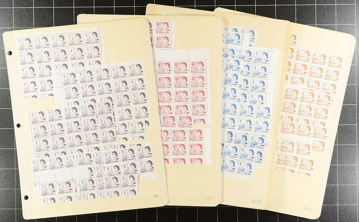 Volume 2 Mint Canada wholesale stock (#410/460). This volume is from the Gzowski issue to the low value Centennials (plus the 7c and 8c later values). Generally, one issue per stockpage. Anywhere from 20 to a couple hundred stamps per page. Lots of multiples with relatively few plate blocks. A quick check indicates that most, if not all, are never hinged. We noted better, such as 15c Geese, Provincial Coat of Arms, Planes, and lots of lower denomination Centennials. Enormous catalogue value here and a conservative face value is $260.00. Estimate =