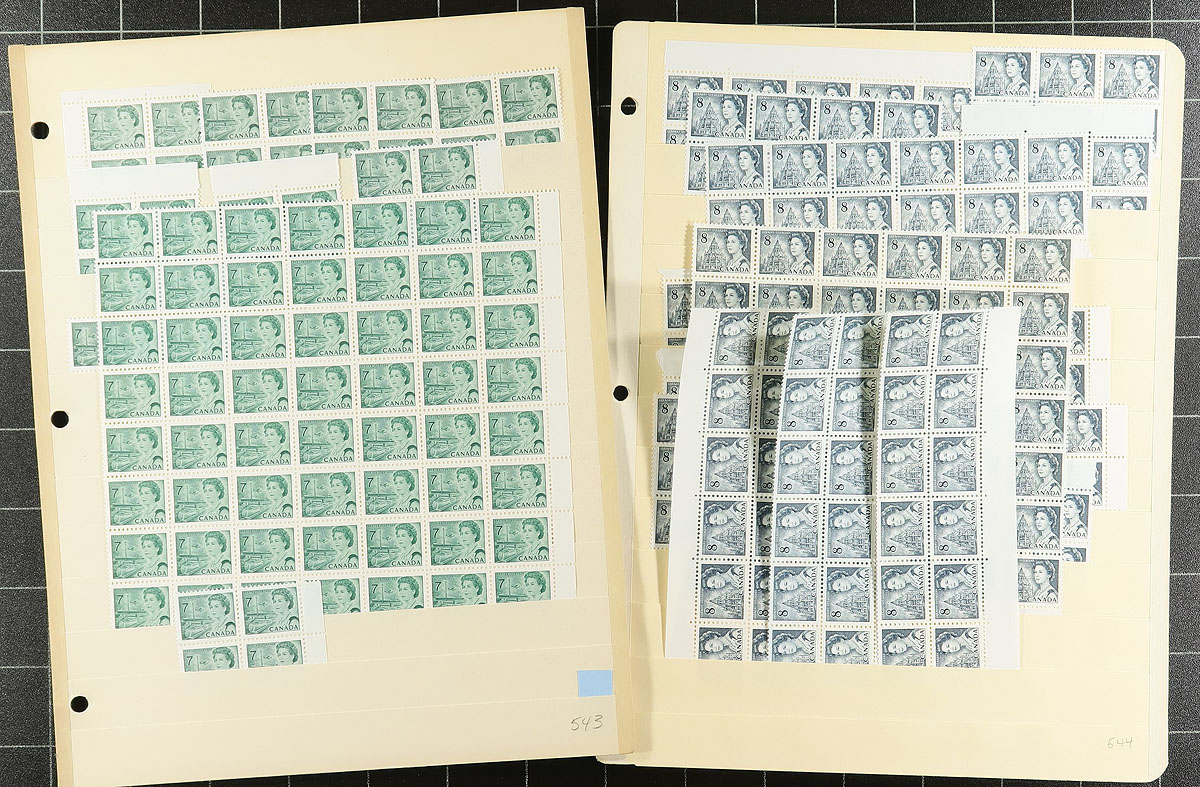 Volume 2 Mint Canada wholesale stock (#410/460). This volume is from the Gzowski issue to the low value Centennials (plus the 7c and 8c later values). Generally, one issue per stockpage. Anywhere from 20 to a couple hundred stamps per page. Lots of multiples with relatively few plate blocks. A quick check indicates that most, if not all, are never hinged. We noted better, such as 15c Geese, Provincial Coat of Arms, Planes, and lots of lower denomination Centennials. Enormous catalogue value here and a conservative face value is $260.00. Estimate =