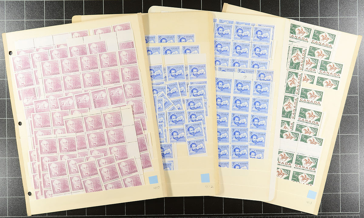 Volume 2 Mint Canada wholesale stock (#410/460). This volume is from the Gzowski issue to the low value Centennials (plus the 7c and 8c later values). Generally, one issue per stockpage. Anywhere from 20 to a couple hundred stamps per page. Lots of multiples with relatively few plate blocks. A quick check indicates that most, if not all, are never hinged. We noted better, such as 15c Geese, Provincial Coat of Arms, Planes, and lots of lower denomination Centennials. Enormous catalogue value here and a conservative face value is $260.00. Estimate =