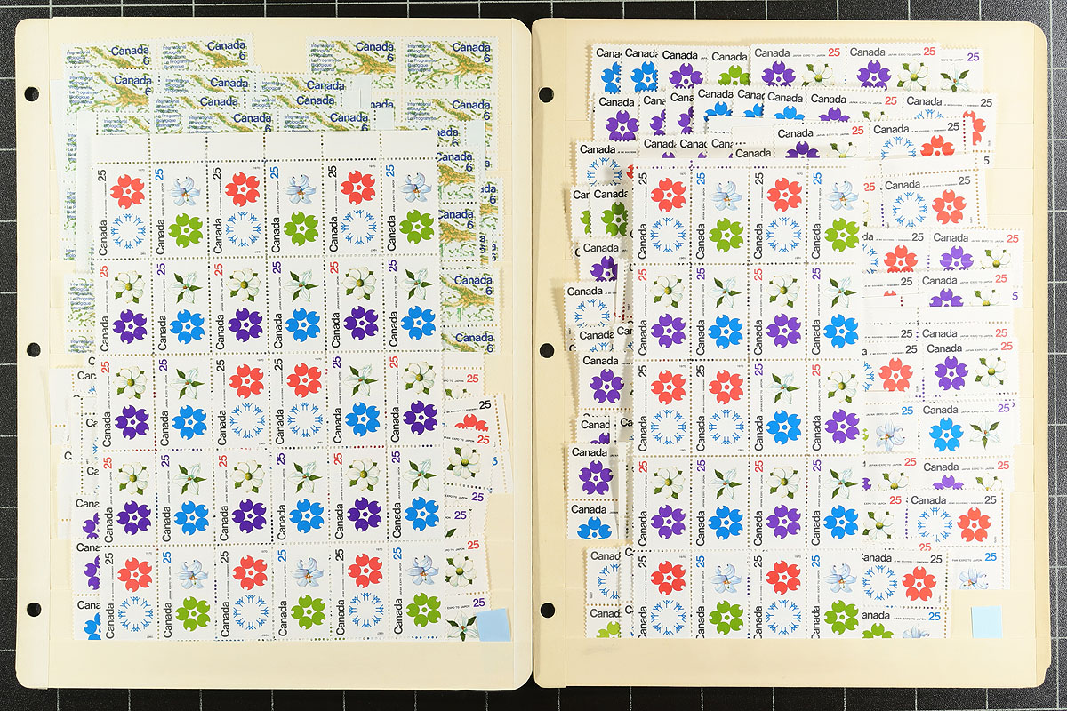 Volume 3 Mint Canada wholesale stock (#486/516). This volume is from the Vimy to the MacKenzie issue. Generally one issue per stockpage. Anywhere from 20 to a couple hundred stamps per page. Lots of multiples with relatively few plate blocks. A quick check indicates that most, if not all, are never hinged. We noted better, such as Vimy, Suzor-Cote, Vickers-Vimy, Birds, Expo ’70 (with opportunity to make many different se-tenant combos), United Nations (some are listed as being fluorescent paper - we have not verified). Enormous catalogue value here and a conservative face value is $404.00. Estimate =