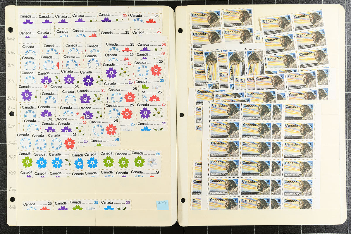 Volume 3 Mint Canada wholesale stock (#486/516). This volume is from the Vimy to the MacKenzie issue. Generally one issue per stockpage. Anywhere from 20 to a couple hundred stamps per page. Lots of multiples with relatively few plate blocks. A quick check indicates that most, if not all, are never hinged. We noted better, such as Vimy, Suzor-Cote, Vickers-Vimy, Birds, Expo ’70 (with opportunity to make many different se-tenant combos), United Nations (some are listed as being fluorescent paper - we have not verified). Enormous catalogue value here and a conservative face value is $404.00. Estimate =