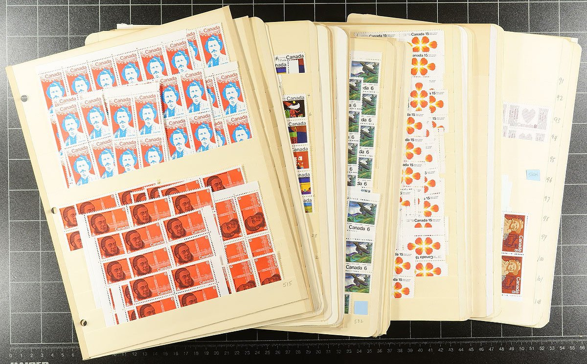 Volume 4 Mint Canada wholesale stock (#515/579). This volume is from the Riel to the Native / Indigenous issues. Generally one issue per stockpage. Anywhere from 20 to a couple hundred stamps per page. Lots of multiples with relatively few plate blocks. A quick check indicates that most, if not all, are never hinged. We noted better: Christmas 1970 (no centre blocks, but lots of blocks, strips and pairs), Radio-Canada. Enormous catalogue value here and a conservative face value of $248.00. Estimate =