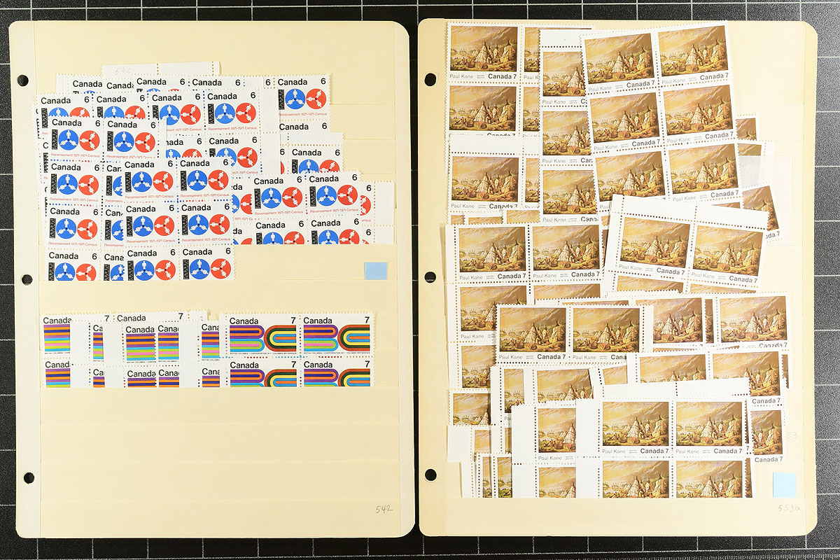 Volume 4 Mint Canada wholesale stock (#515/579). This volume is from the Riel to the Native / Indigenous issues. Generally one issue per stockpage. Anywhere from 20 to a couple hundred stamps per page. Lots of multiples with relatively few plate blocks. A quick check indicates that most, if not all, are never hinged. We noted better: Christmas 1970 (no centre blocks, but lots of blocks, strips and pairs), Radio-Canada. Enormous catalogue value here and a conservative face value of $248.00. Estimate =