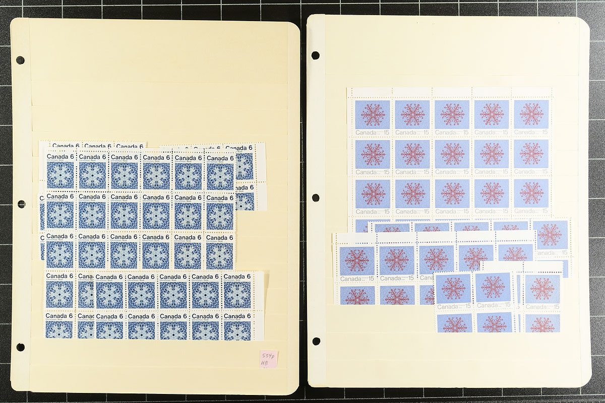 Volume 4 Mint Canada wholesale stock (#515/579). This volume is from the Riel to the Native / Indigenous issues. Generally one issue per stockpage. Anywhere from 20 to a couple hundred stamps per page. Lots of multiples with relatively few plate blocks. A quick check indicates that most, if not all, are never hinged. We noted better: Christmas 1970 (no centre blocks, but lots of blocks, strips and pairs), Radio-Canada. Enormous catalogue value here and a conservative face value of $248.00. Estimate =