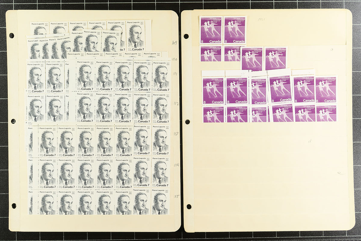 Volume 4 Mint Canada wholesale stock (#515/579). This volume is from the Riel to the Native / Indigenous issues. Generally one issue per stockpage. Anywhere from 20 to a couple hundred stamps per page. Lots of multiples with relatively few plate blocks. A quick check indicates that most, if not all, are never hinged. We noted better: Christmas 1970 (no centre blocks, but lots of blocks, strips and pairs), Radio-Canada. Enormous catalogue value here and a conservative face value of $248.00. Estimate =