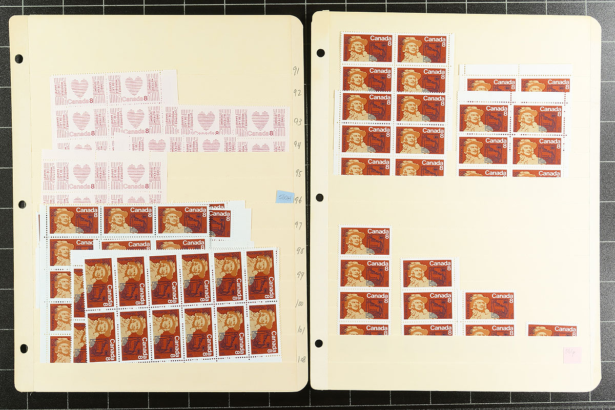 Volume 4 Mint Canada wholesale stock (#515/579). This volume is from the Riel to the Native / Indigenous issues. Generally one issue per stockpage. Anywhere from 20 to a couple hundred stamps per page. Lots of multiples with relatively few plate blocks. A quick check indicates that most, if not all, are never hinged. We noted better: Christmas 1970 (no centre blocks, but lots of blocks, strips and pairs), Radio-Canada. Enormous catalogue value here and a conservative face value of $248.00. Estimate =