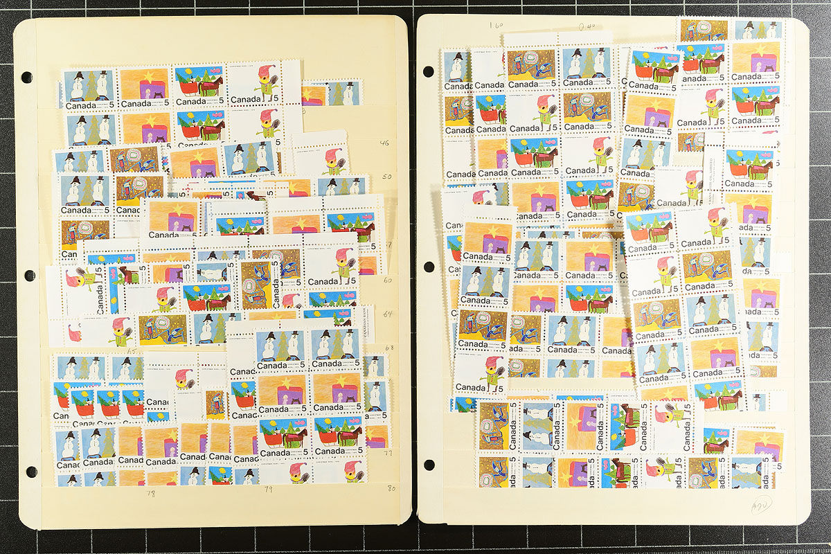 Volume 4 Mint Canada wholesale stock (#515/579). This volume is from the Riel to the Native / Indigenous issues. Generally one issue per stockpage. Anywhere from 20 to a couple hundred stamps per page. Lots of multiples with relatively few plate blocks. A quick check indicates that most, if not all, are never hinged. We noted better: Christmas 1970 (no centre blocks, but lots of blocks, strips and pairs), Radio-Canada. Enormous catalogue value here and a conservative face value of $248.00. Estimate =