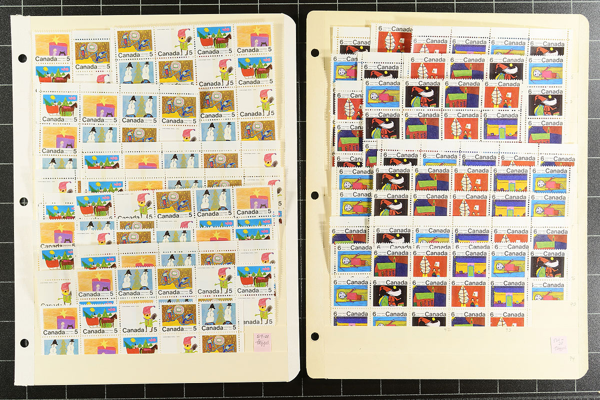 Volume 4 Mint Canada wholesale stock (#515/579). This volume is from the Riel to the Native / Indigenous issues. Generally one issue per stockpage. Anywhere from 20 to a couple hundred stamps per page. Lots of multiples with relatively few plate blocks. A quick check indicates that most, if not all, are never hinged. We noted better: Christmas 1970 (no centre blocks, but lots of blocks, strips and pairs), Radio-Canada. Enormous catalogue value here and a conservative face value of $248.00. Estimate =