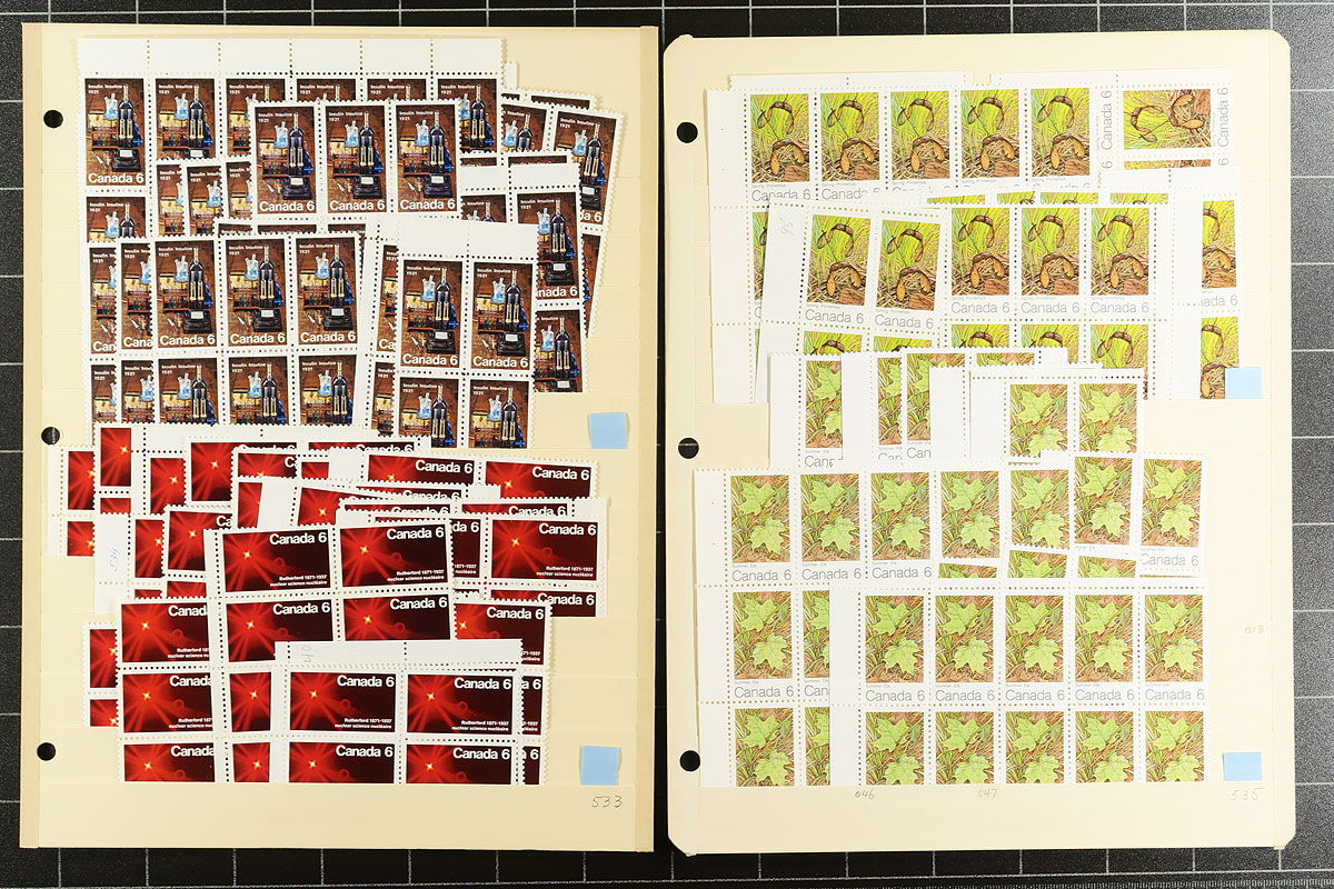 Volume 4 Mint Canada wholesale stock (#515/579). This volume is from the Riel to the Native / Indigenous issues. Generally one issue per stockpage. Anywhere from 20 to a couple hundred stamps per page. Lots of multiples with relatively few plate blocks. A quick check indicates that most, if not all, are never hinged. We noted better: Christmas 1970 (no centre blocks, but lots of blocks, strips and pairs), Radio-Canada. Enormous catalogue value here and a conservative face value of $248.00. Estimate =