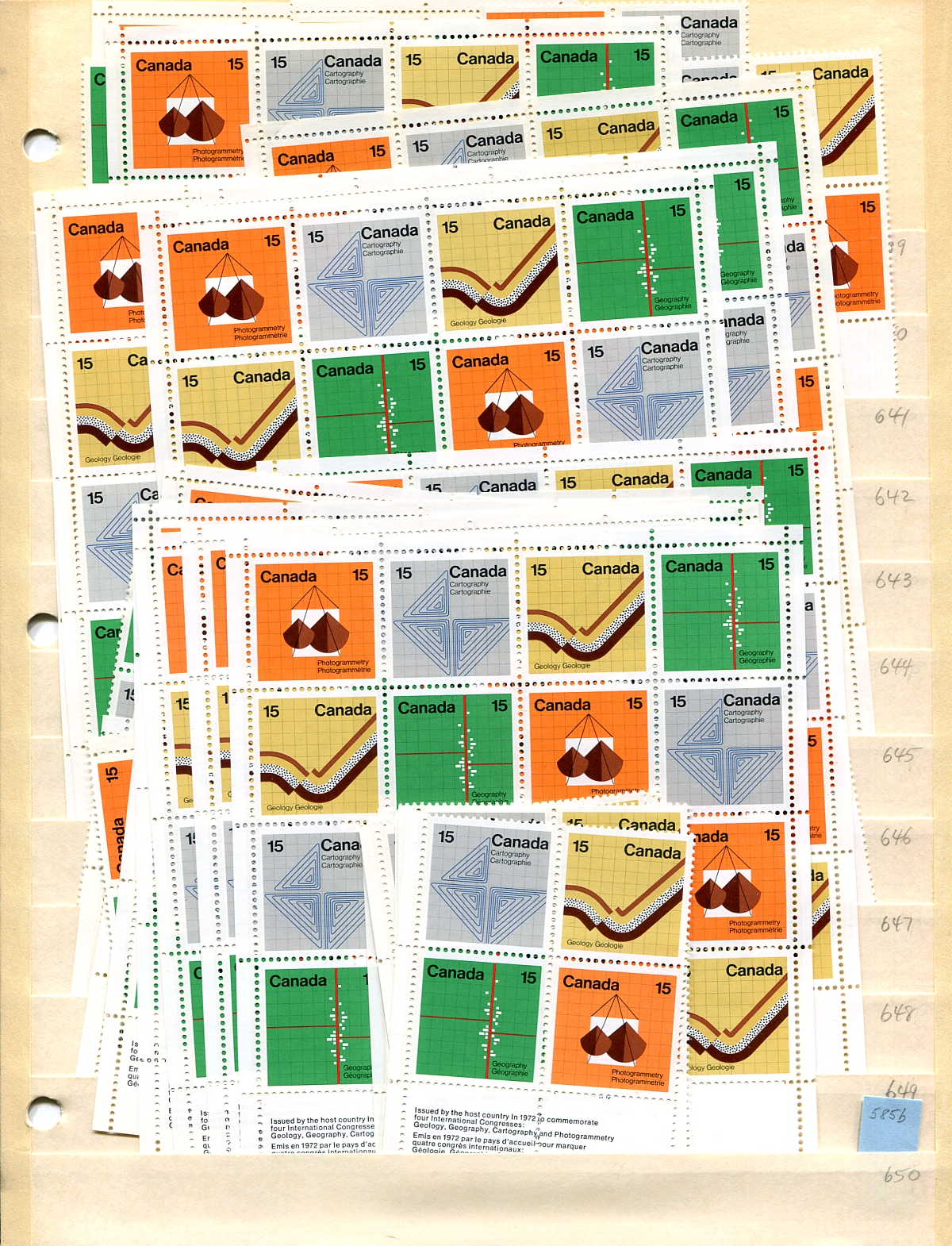 Mint Holding of Canada’s first sheetlet, the Geological Congress issue confused collectors. Some stuck with single stamps, others with plate blocks and some with the sheetlet of 16. By the time they realized how many copies the average collector would need, the issue was off sale and prices almost immediately began to rise. This lot of three stockpages has a mix of complete mint never hinged sheetlets of 16, in both the regular and "tagged" version. A total of 33 "philatelic" sheetlets in total, plus a smattering of blocks and plate blocks which are not counted in the total catalogue value. 2024 Unitrade =