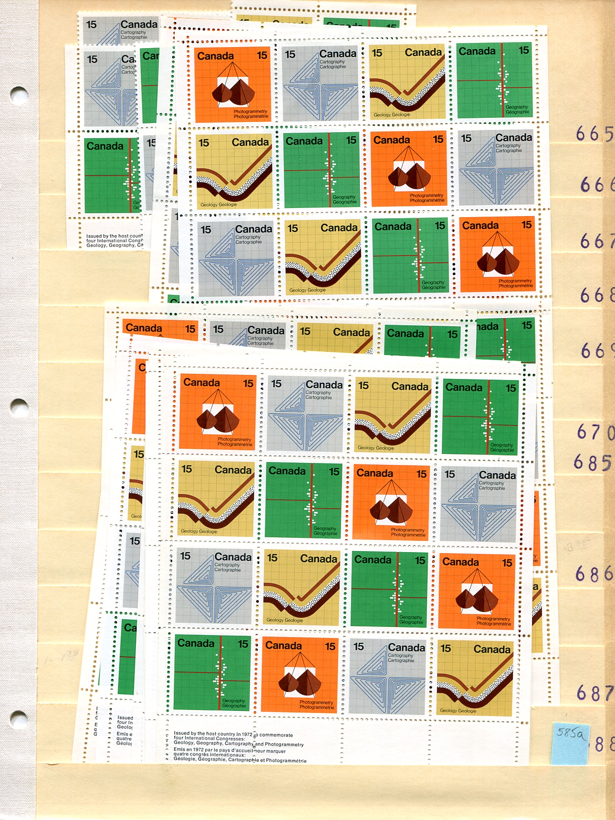 Mint Holding of Canada’s first sheetlet, the Geological Congress issue confused collectors. Some stuck with single stamps, others with plate blocks and some with the sheetlet of 16. By the time they realized how many copies the average collector would need, the issue was off sale and prices almost immediately began to rise. This lot of three stockpages has a mix of complete mint never hinged sheetlets of 16, in both the regular and "tagged" version. A total of 33 "philatelic" sheetlets in total, plus a smattering of blocks and plate blocks which are not counted in the total catalogue value. 2024 Unitrade =