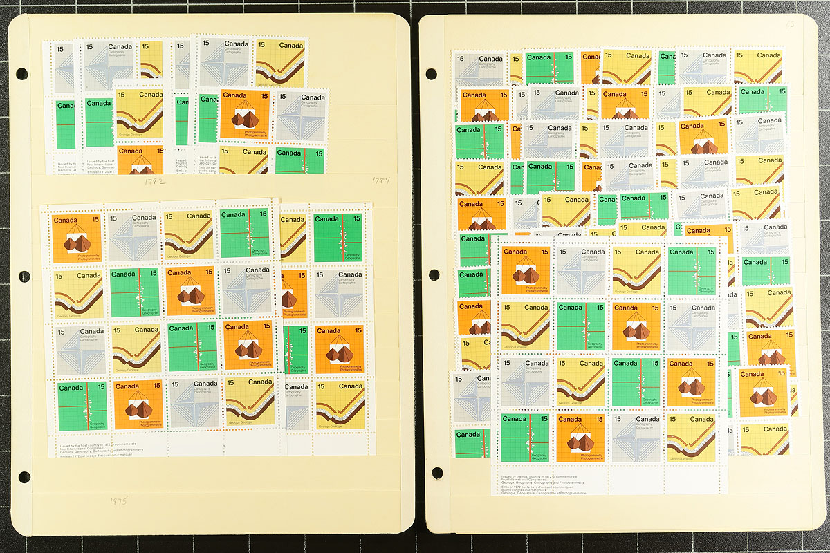 Mint Accumulation. Canada’s first sheetlet, the Geological Congress issue confused collectors. Some stuck with single stamps, others with plate blocks and some with the sheetlet of 16. By the time they realized how many copies the average collector would need, the issue was off sale and prices almost immediately began to rise. This lot of six stockpages has a mix of complete mint never hinged sheetlets of 16, in both the regular and "tagged" version. 20 "philatelic" sheetlets in total, plus about 100 blocks of four and 20 inscription blocks. 2024 Unitrade =