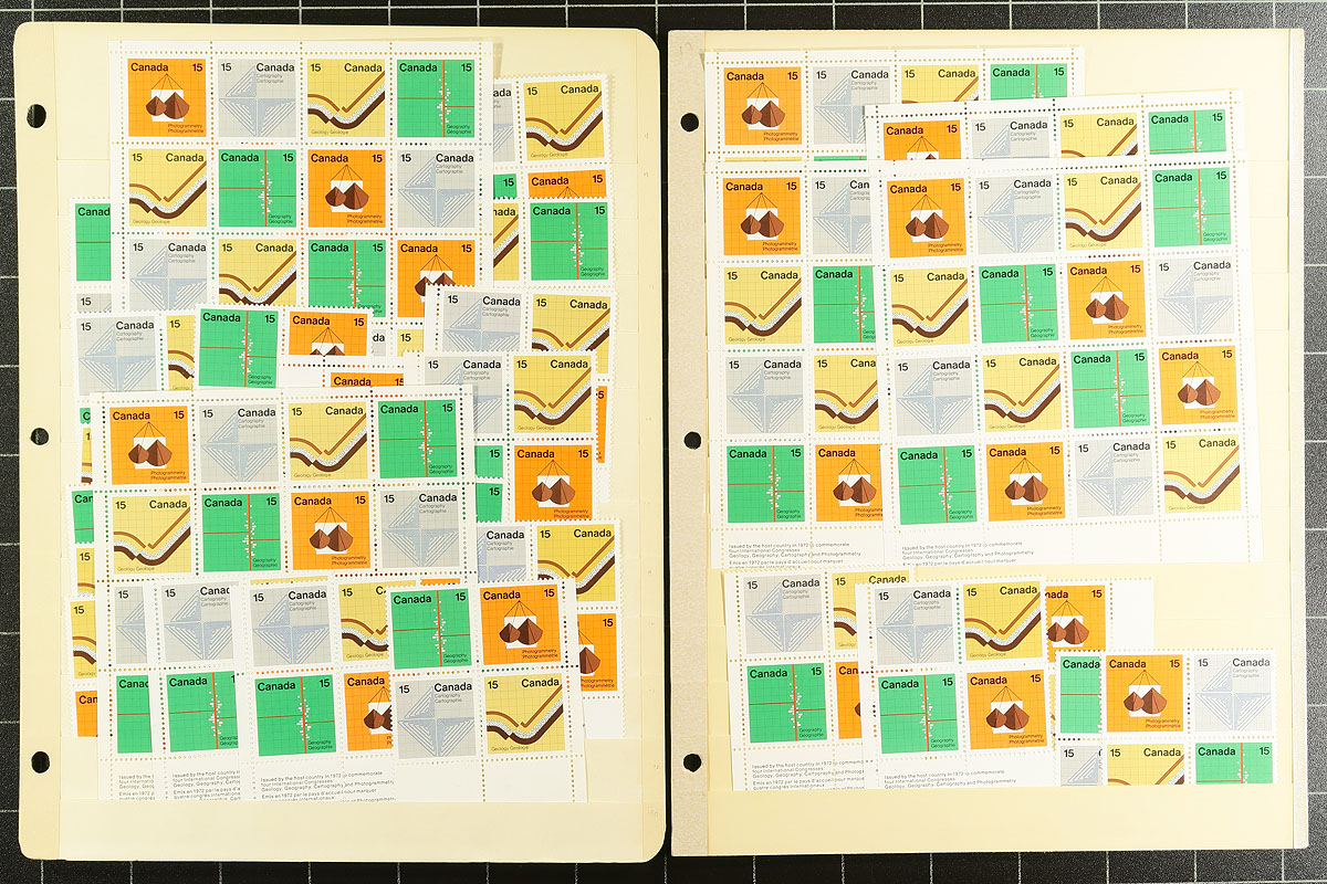 Mint Accumulation. Canada’s first sheetlet, the Geological Congress issue confused collectors. Some stuck with single stamps, others with plate blocks and some with the sheetlet of 16. By the time they realized how many copies the average collector would need, the issue was off sale and prices almost immediately began to rise. This lot of six stockpages has a mix of complete mint never hinged sheetlets of 16, in both the regular and "tagged" version. 20 "philatelic" sheetlets in total, plus about 100 blocks of four and 20 inscription blocks. 2024 Unitrade =