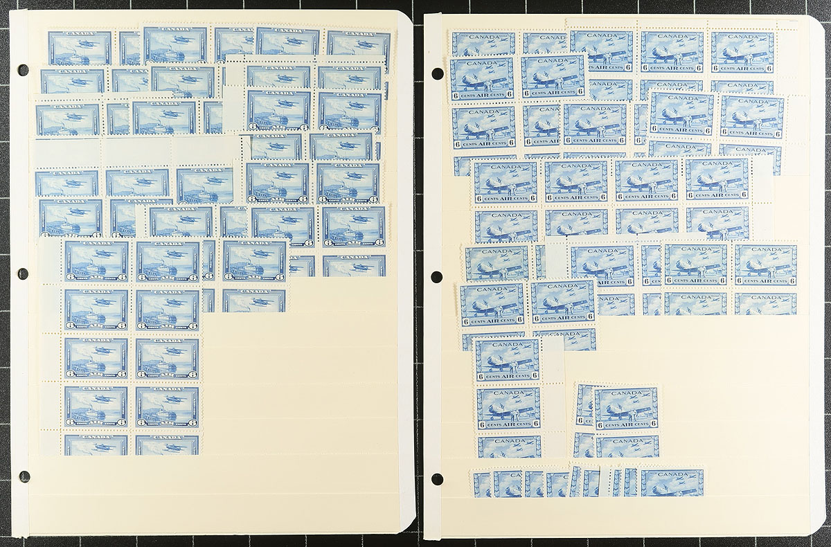 High quality mint, and seemingly all never hinged, accumulation of airmail and special delivery issues of Canada. Most are in blocks of various sizes (we did note a complete sheet of #C6). Up to about 100 copies of a type. Centering is good and appearance is fresh. A very nice grouping, laid out on one stamp per stockpage. 2024 Scott US$4677.00 =