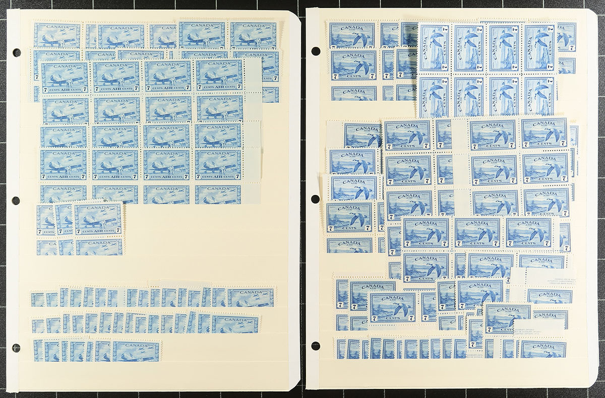 High quality mint, and seemingly all never hinged, accumulation of airmail and special delivery issues of Canada. Most are in blocks of various sizes (we did note a complete sheet of #C6). Up to about 100 copies of a type. Centering is good and appearance is fresh. A very nice grouping, laid out on one stamp per stockpage. 2024 Scott US$4677.00 =