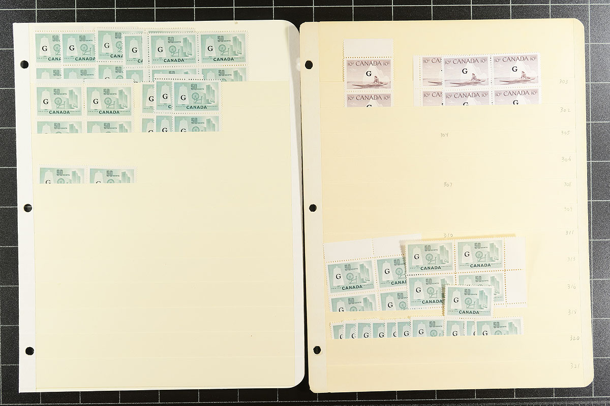 High quality mint, and seemingly all never hinged, accumulation of "OHMS" and "G" overprinted official issues of Canada. Most are in blocks of various sizes (we note a nice block of 25 of #O2, 15 singles of #O24, a matched plate #1 set of plate blocks (and four more blocks) of Totem #O32). Up to about 100 copies of a type. Centering is good and appearance is fresh. A very nice grouping, laid out on one stamp per stockpage. 2024 Scott US$3986.45 =