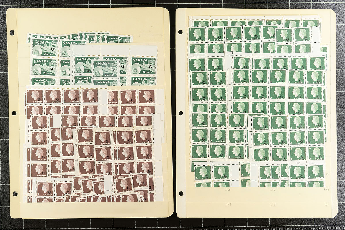 High quality mint, and seemingly all never hinged, accumulation of "OHMS" and "G" overprinted official issues of Canada. Most are in blocks of various sizes (we note a nice block of 25 of #O2, 15 singles of #O24, a matched plate #1 set of plate blocks (and four more blocks) of Totem #O32). Up to about 100 copies of a type. Centering is good and appearance is fresh. A very nice grouping, laid out on one stamp per stockpage. 2024 Scott US$3986.45 =