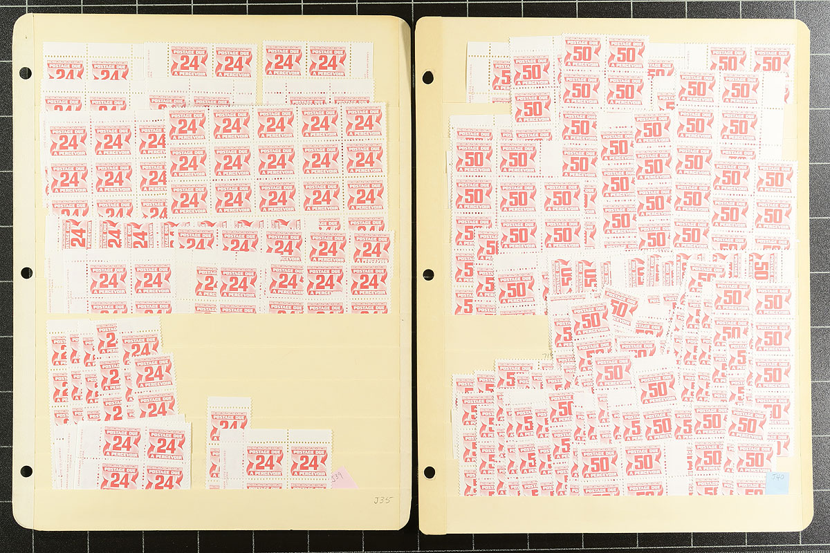 High quality mint, and seemingly all never hinged, accumulation of the 3c and 10c denominations of the last purple postage due issue and an extensive holding of the "red dues" including paper types. Up to about 100 copies of a type (we noted a page of #J28iii including a couple of plate blocks). The original face value to purchase these would have been a few hundred dollars. Centering is good and appearance is fresh. A very nice grouping, laid out on one stamp per stockpage. Estimate =