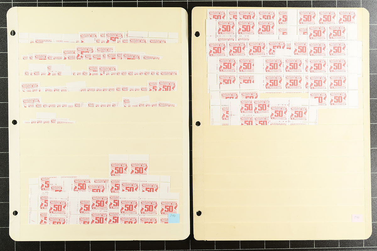 High quality mint, and seemingly all never hinged, accumulation of the 3c and 10c denominations of the last purple postage due issue and an extensive holding of the "red dues" including paper types. Up to about 100 copies of a type (we noted a page of #J28iii including a couple of plate blocks). The original face value to purchase these would have been a few hundred dollars. Centering is good and appearance is fresh. A very nice grouping, laid out on one stamp per stockpage. Estimate =