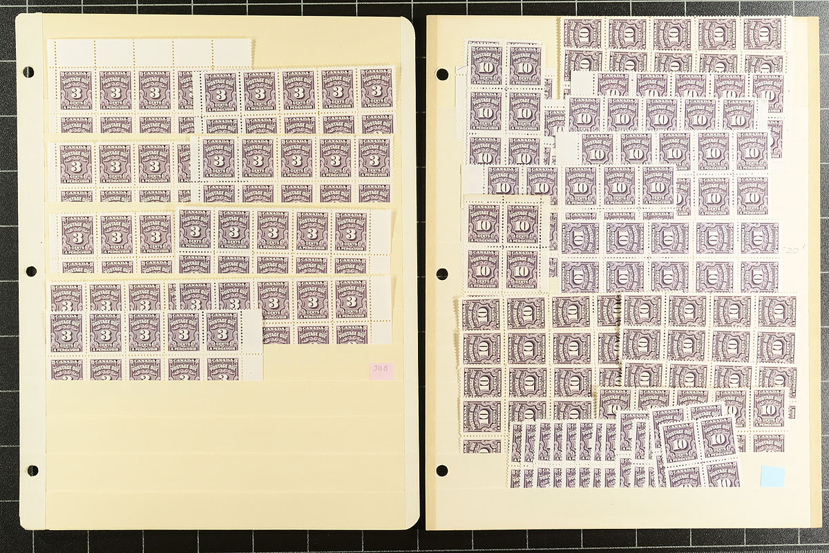 High quality mint, and seemingly all never hinged, accumulation of the 3c and 10c denominations of the last purple postage due issue and an extensive holding of the "red dues" including paper types. Up to about 100 copies of a type (we noted a page of #J28iii including a couple of plate blocks). The original face value to purchase these would have been a few hundred dollars. Centering is good and appearance is fresh. A very nice grouping, laid out on one stamp per stockpage. Estimate =
