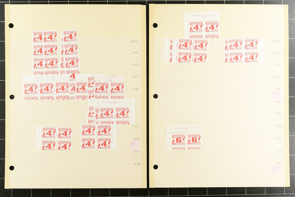 High quality mint, and seemingly all never hinged, accumulation of the 3c and 10c denominations of the last purple postage due issue and an extensive holding of the "red dues" including paper types. Up to about 100 copies of a type (we noted a page of #J28iii including a couple of plate blocks). The original face value to purchase these would have been a few hundred dollars. Centering is good and appearance is fresh. A very nice grouping, laid out on one stamp per stockpage. Estimate =