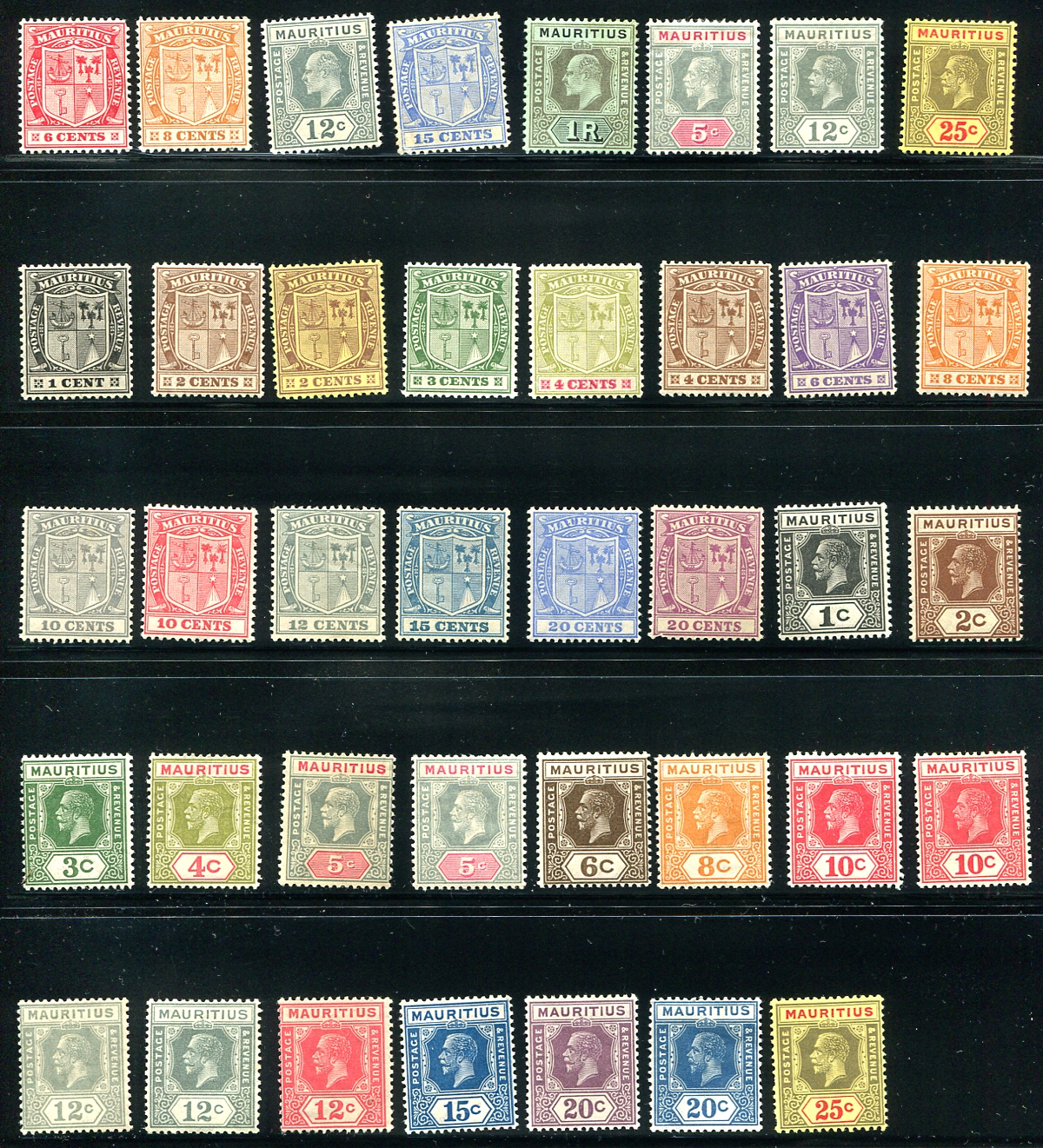 A couple of pages with a range of early Mauritius with a number of Queen Victoria side faces (three with nice wing margins). There are some fresh appearing "Coat of Arms", with some King Edward VII and King George V "Keyplates" with denominations to 1R. All different, noting better such as #67, #69, #109, #115, #129, #136. The very early have the usual mixed condition. The hinging is heavy in a couple of areas. Still great classic material here. 2024 Scott US$704.25 =