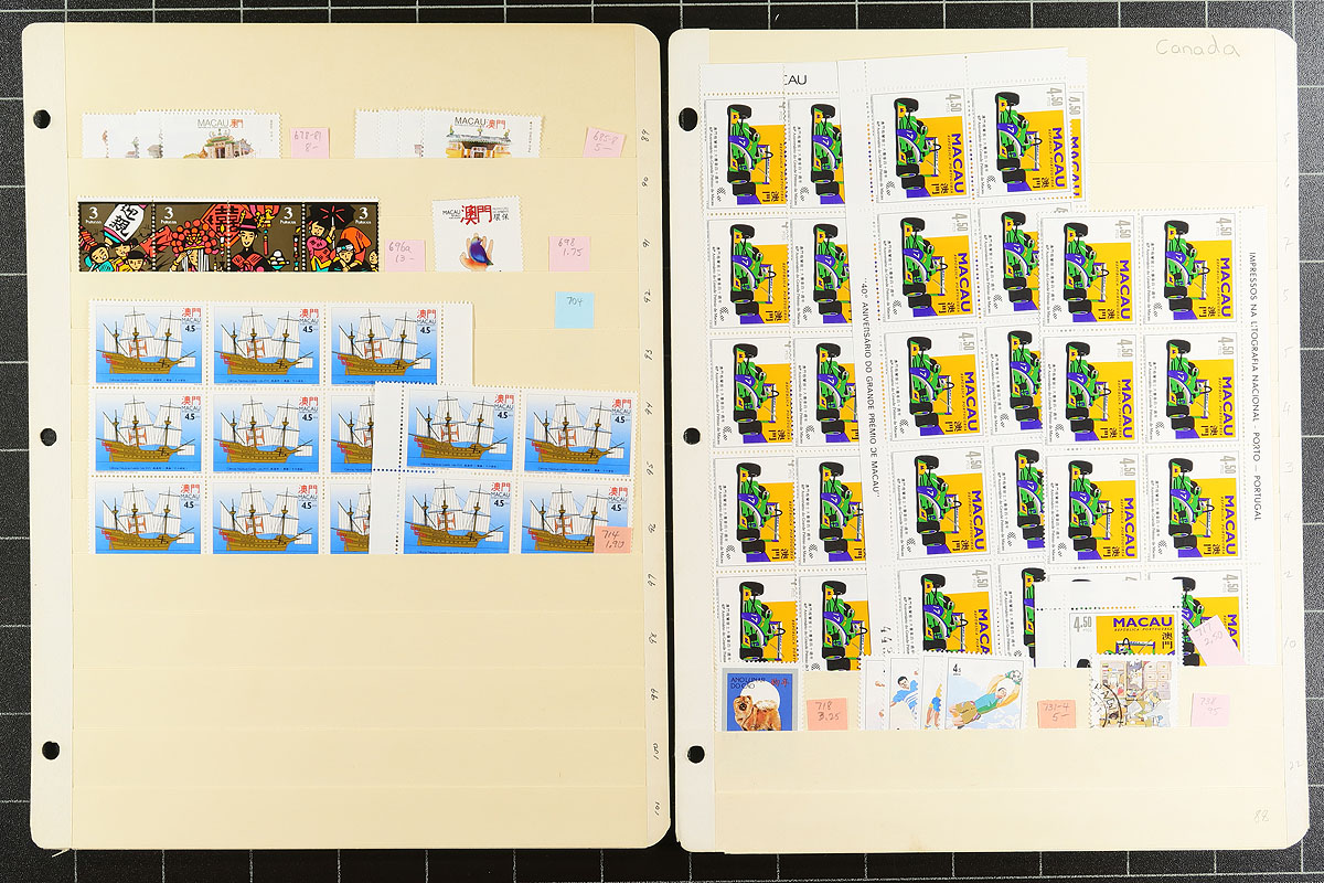 Collector accumulations of mint and used Macau are not often seen locally. This is a very well organized group on 29 manila stockpages, including good representation from the "back of the book". Some notable better includes #333, #339, #347A (x4), #365-367 (mint), #371 (4x mint), #427-428. Generally up to a dozen of a type, but a few of the more modern issues are in larger mint blocks. The catalogue value of this former Asian Portuguese colony adds up surprisingly quickly. Items individually identified. Few faults are expected. Estimate =