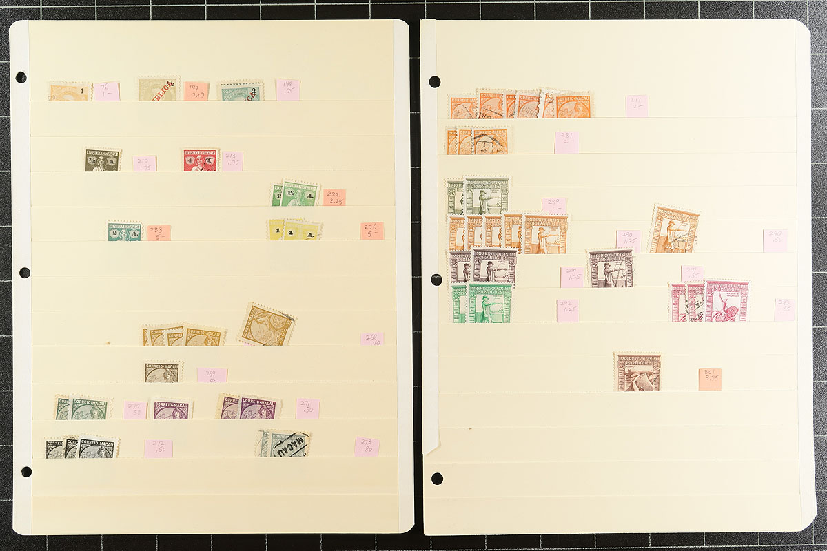 Collector accumulations of mint and used Macau are not often seen locally. This is a very well organized group on 29 manila stockpages, including good representation from the "back of the book". Some notable better includes #333, #339, #347A (x4), #365-367 (mint), #371 (4x mint), #427-428. Generally up to a dozen of a type, but a few of the more modern issues are in larger mint blocks. The catalogue value of this former Asian Portuguese colony adds up surprisingly quickly. Items individually identified. Few faults are expected. Estimate =