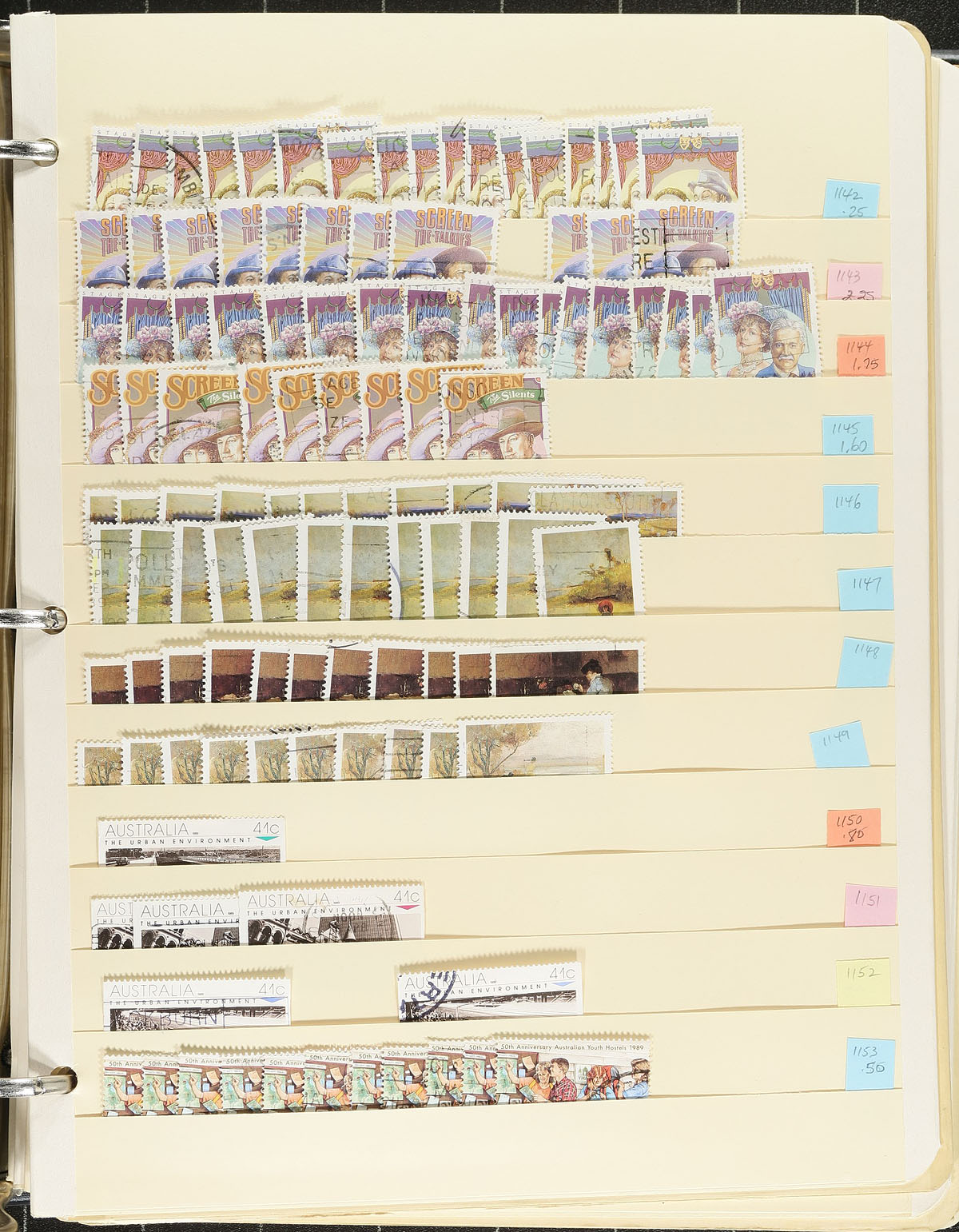 Extensive used accumulation of regular issues circa 1970-1996 on over 110 manila stockpages and packed into three large binders. Extensive coverage with up to a dozen of a type, including lots of sets (with many of the higher values paying overseas rates). Better singles include a block of seven from the Christmas ’71 issue (#508), and several complete "Famous Australian" booklet panes (#454a-457a (First day cancels) and #514a-517a (2 sets). Also noted the paintings to $10.00 (#579) and 8 copies of the $20 Uluru (#1135). About 10,000 stamps here, neatly organized and identified, and unknown (but massive) catalogue value. No souvenir sheets. Estimate =