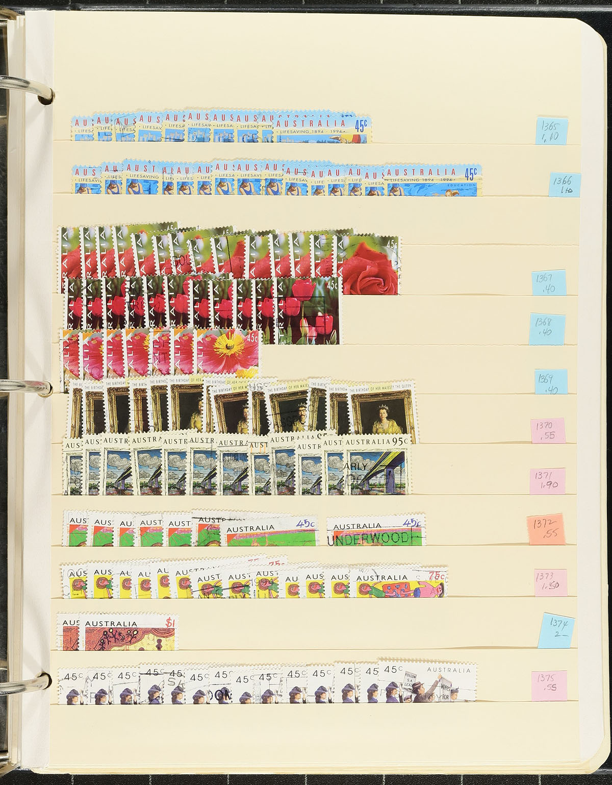 Extensive used accumulation of regular issues circa 1970-1996 on over 110 manila stockpages and packed into three large binders. Extensive coverage with up to a dozen of a type, including lots of sets (with many of the higher values paying overseas rates). Better singles include a block of seven from the Christmas ’71 issue (#508), and several complete "Famous Australian" booklet panes (#454a-457a (First day cancels) and #514a-517a (2 sets). Also noted the paintings to $10.00 (#579) and 8 copies of the $20 Uluru (#1135). About 10,000 stamps here, neatly organized and identified, and unknown (but massive) catalogue value. No souvenir sheets. Estimate =