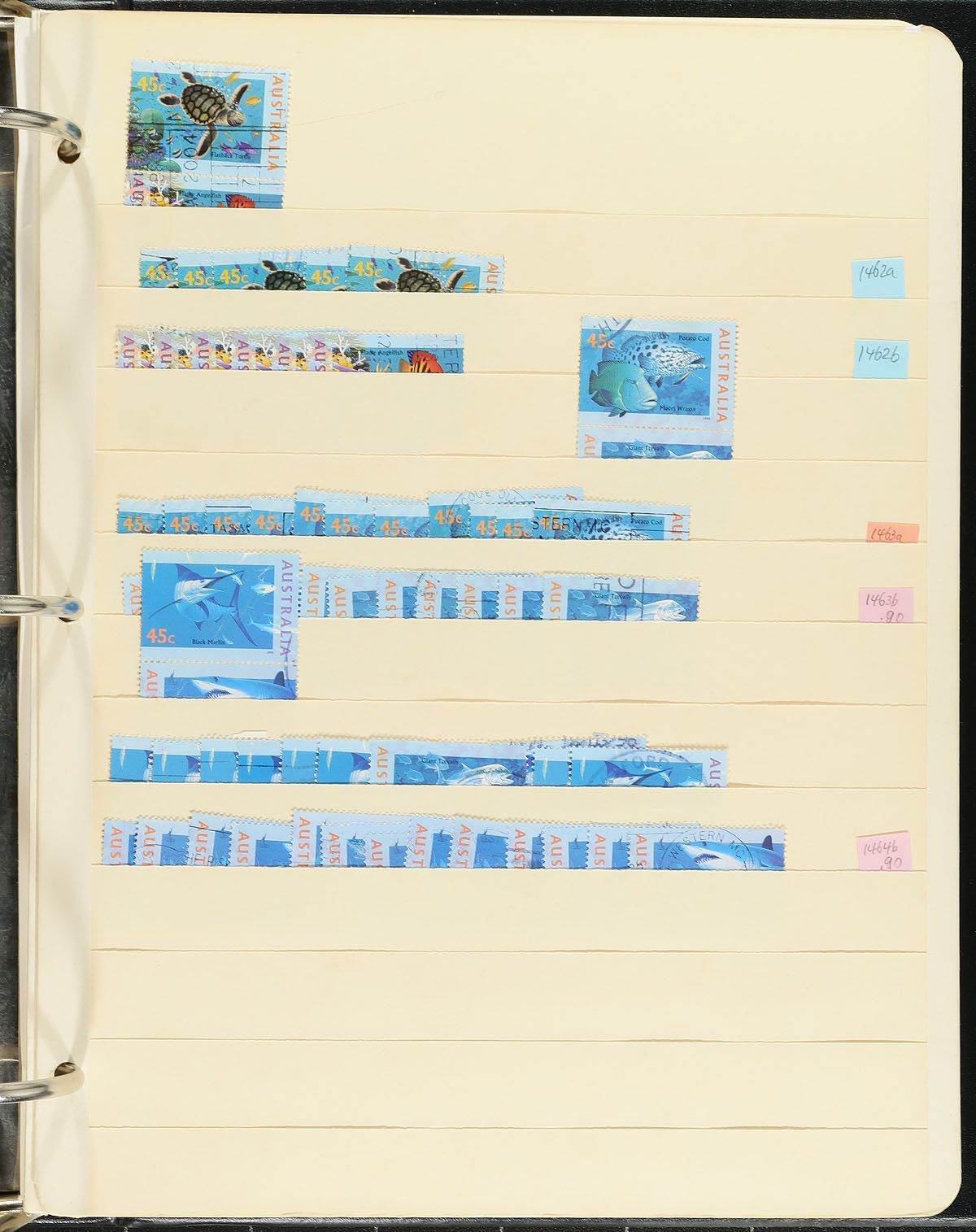 Extensive used accumulation of regular issues circa 1970-1996 on over 110 manila stockpages and packed into three large binders. Extensive coverage with up to a dozen of a type, including lots of sets (with many of the higher values paying overseas rates). Better singles include a block of seven from the Christmas ’71 issue (#508), and several complete "Famous Australian" booklet panes (#454a-457a (First day cancels) and #514a-517a (2 sets). Also noted the paintings to $10.00 (#579) and 8 copies of the $20 Uluru (#1135). About 10,000 stamps here, neatly organized and identified, and unknown (but massive) catalogue value. No souvenir sheets. Estimate =