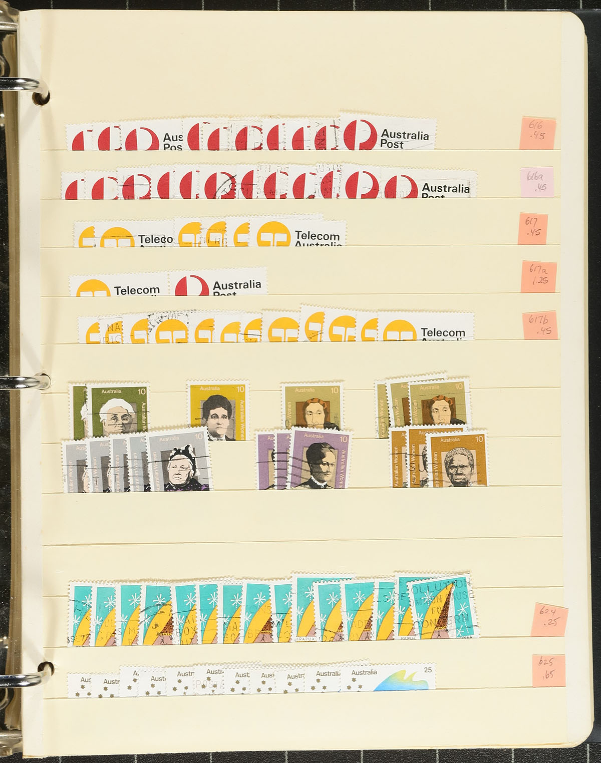 Extensive used accumulation of regular issues circa 1970-1996 on over 110 manila stockpages and packed into three large binders. Extensive coverage with up to a dozen of a type, including lots of sets (with many of the higher values paying overseas rates). Better singles include a block of seven from the Christmas ’71 issue (#508), and several complete "Famous Australian" booklet panes (#454a-457a (First day cancels) and #514a-517a (2 sets). Also noted the paintings to $10.00 (#579) and 8 copies of the $20 Uluru (#1135). About 10,000 stamps here, neatly organized and identified, and unknown (but massive) catalogue value. No souvenir sheets. Estimate =