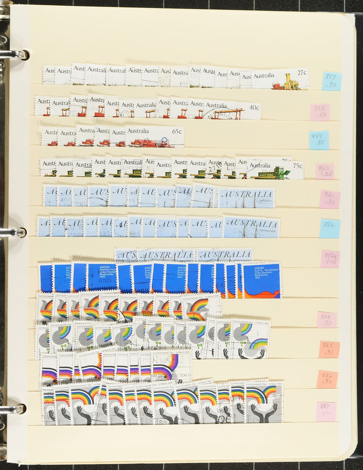 Extensive used accumulation of regular issues circa 1970-1996 on over 110 manila stockpages and packed into three large binders. Extensive coverage with up to a dozen of a type, including lots of sets (with many of the higher values paying overseas rates). Better singles include a block of seven from the Christmas ’71 issue (#508), and several complete "Famous Australian" booklet panes (#454a-457a (First day cancels) and #514a-517a (2 sets). Also noted the paintings to $10.00 (#579) and 8 copies of the $20 Uluru (#1135). About 10,000 stamps here, neatly organized and identified, and unknown (but massive) catalogue value. No souvenir sheets. Estimate =