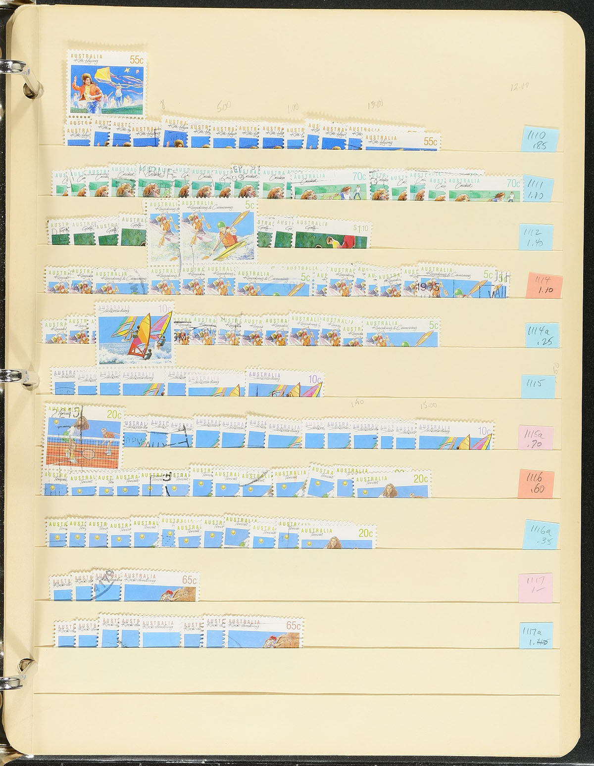 Extensive used accumulation of regular issues circa 1970-1996 on over 110 manila stockpages and packed into three large binders. Extensive coverage with up to a dozen of a type, including lots of sets (with many of the higher values paying overseas rates). Better singles include a block of seven from the Christmas ’71 issue (#508), and several complete "Famous Australian" booklet panes (#454a-457a (First day cancels) and #514a-517a (2 sets). Also noted the paintings to $10.00 (#579) and 8 copies of the $20 Uluru (#1135). About 10,000 stamps here, neatly organized and identified, and unknown (but massive) catalogue value. No souvenir sheets. Estimate =