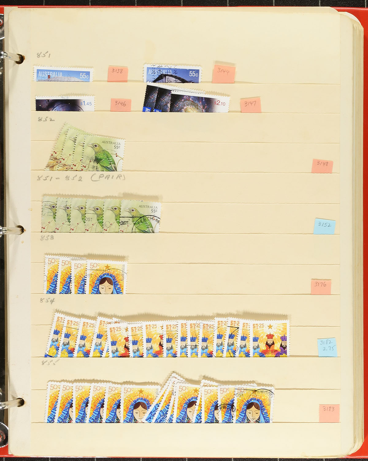 Extensive used accumulation of regular issues circa 1996 into the 2010's on over 100 manila stockpages and packed into three binders. Coverage is strong in some areas and thinner in others, not unusual give the drop in mail that accelerated in the new Millennium. There are up to a dozen of a type, including lots of sets (with many of the higher values paying overseas rates). Better singles include $10 Kakadu (#1535) and Devil’s Marbles (#1846), plus the $20 Uluru (a dozen copies of #1982). A few thousand stamps are neatly organized and identified. Mid-value stamps from this era often catalogue $2-$4. per stamp, which will lead to a massive total catalogue value. Holdings this modern are not seen very often. No souvenir sheets. Estimate =