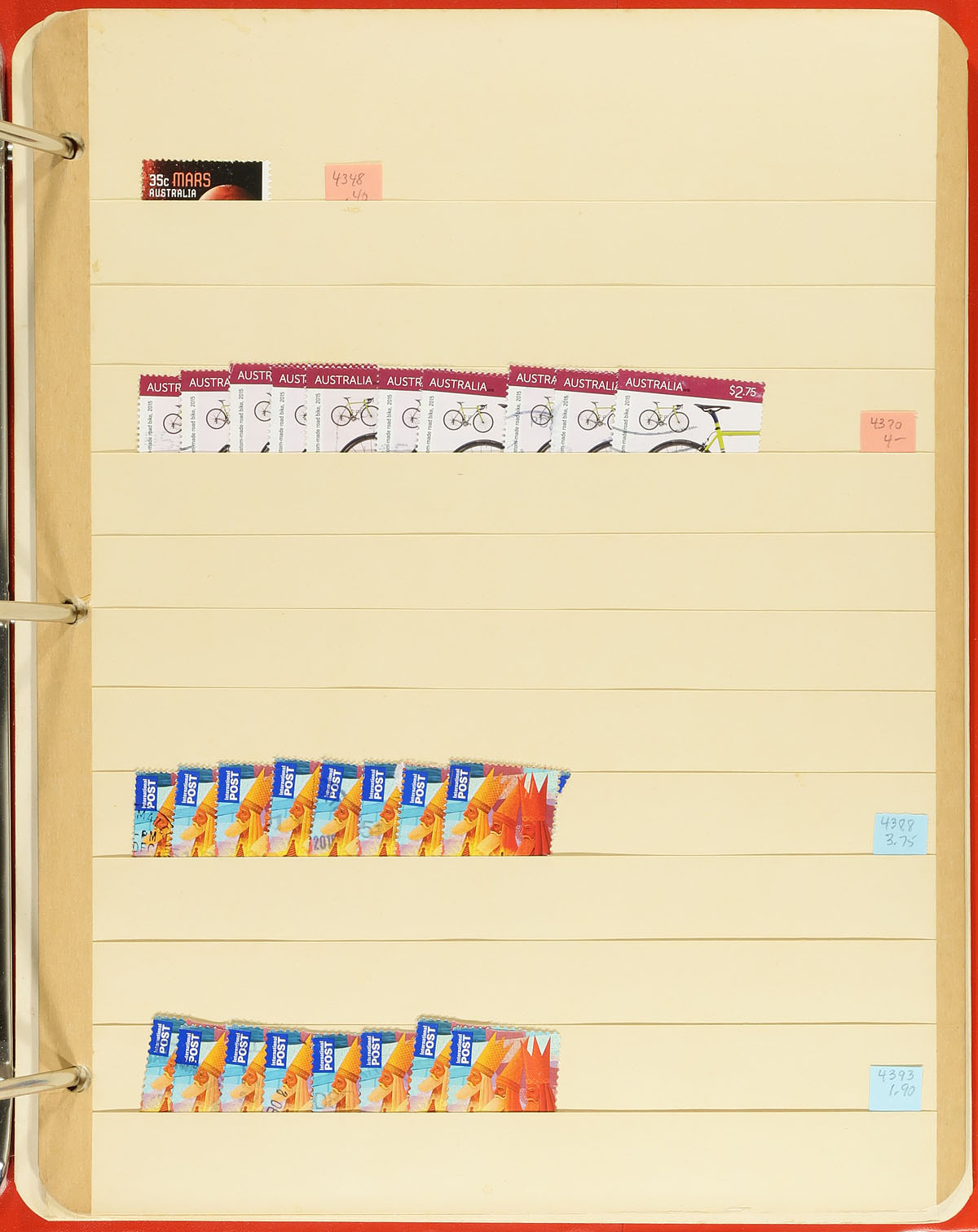 Extensive used accumulation of regular issues circa 1996 into the 2010's on over 100 manila stockpages and packed into three binders. Coverage is strong in some areas and thinner in others, not unusual give the drop in mail that accelerated in the new Millennium. There are up to a dozen of a type, including lots of sets (with many of the higher values paying overseas rates). Better singles include $10 Kakadu (#1535) and Devil’s Marbles (#1846), plus the $20 Uluru (a dozen copies of #1982). A few thousand stamps are neatly organized and identified. Mid-value stamps from this era often catalogue $2-$4. per stamp, which will lead to a massive total catalogue value. Holdings this modern are not seen very often. No souvenir sheets. Estimate =