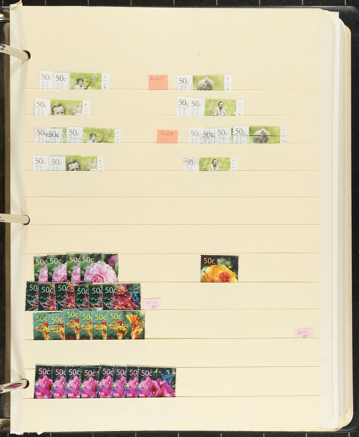 Extensive used accumulation of regular issues circa 1996 into the 2010's on over 100 manila stockpages and packed into three binders. Coverage is strong in some areas and thinner in others, not unusual give the drop in mail that accelerated in the new Millennium. There are up to a dozen of a type, including lots of sets (with many of the higher values paying overseas rates). Better singles include $10 Kakadu (#1535) and Devil’s Marbles (#1846), plus the $20 Uluru (a dozen copies of #1982). A few thousand stamps are neatly organized and identified. Mid-value stamps from this era often catalogue $2-$4. per stamp, which will lead to a massive total catalogue value. Holdings this modern are not seen very often. No souvenir sheets. Estimate =