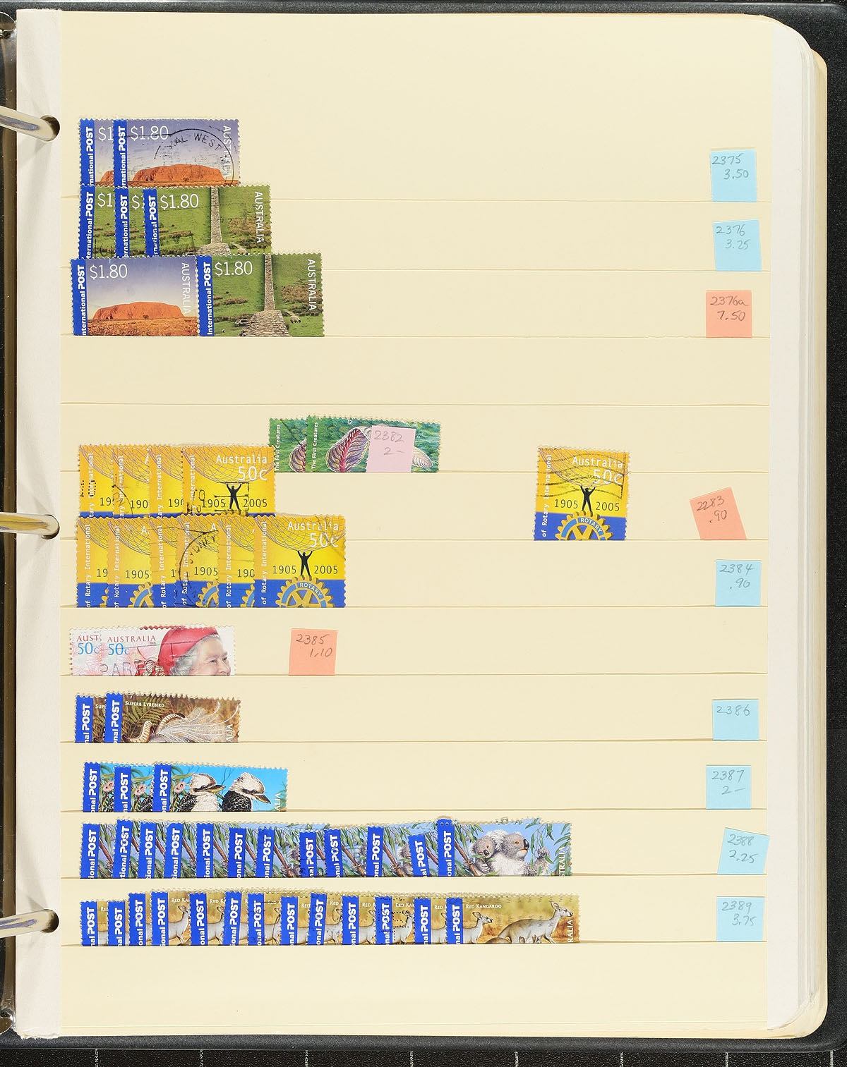 Extensive used accumulation of regular issues circa 1996 into the 2010's on over 100 manila stockpages and packed into three binders. Coverage is strong in some areas and thinner in others, not unusual give the drop in mail that accelerated in the new Millennium. There are up to a dozen of a type, including lots of sets (with many of the higher values paying overseas rates). Better singles include $10 Kakadu (#1535) and Devil’s Marbles (#1846), plus the $20 Uluru (a dozen copies of #1982). A few thousand stamps are neatly organized and identified. Mid-value stamps from this era often catalogue $2-$4. per stamp, which will lead to a massive total catalogue value. Holdings this modern are not seen very often. No souvenir sheets. Estimate =